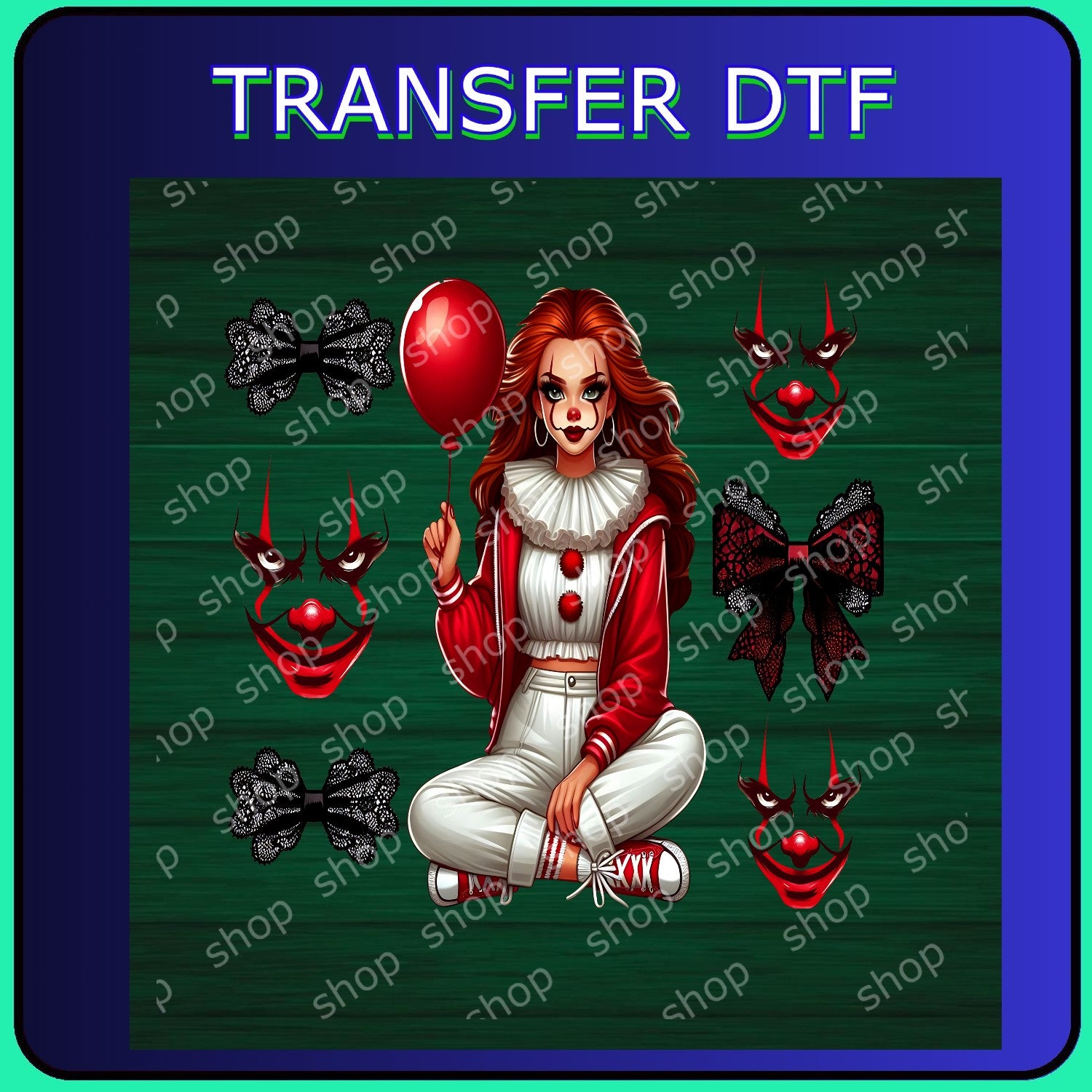 Transfer DTF de alta calidad con diseño de payasa de terror femenina, con globo rojo y detalles de lazos y máscaras 🎃🎈. Perfecto para prendas textiles que busquen un estilo único, glamoroso y espeluznante en Halloween. Disponible en distintos tamaños; si deseas más pequeño o más grande, comunícate conmigo.