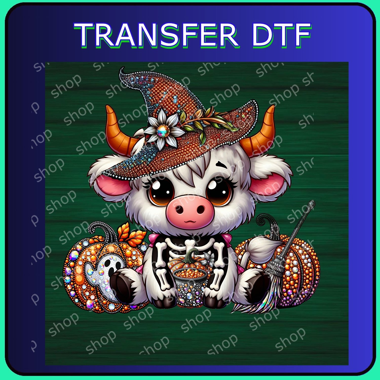 Transfer DTF de alta calidad con diseño tierno de vaquita disfrazada de esqueleto y sombrero de bruja, acompañada de calabazas decoradas 🎃✨. Perfecto para prendas infantiles y festivas en esta temporada de Halloween. Disponible en distintos tamaños; si deseas más pequeño o más grande, comunícate conmigo.