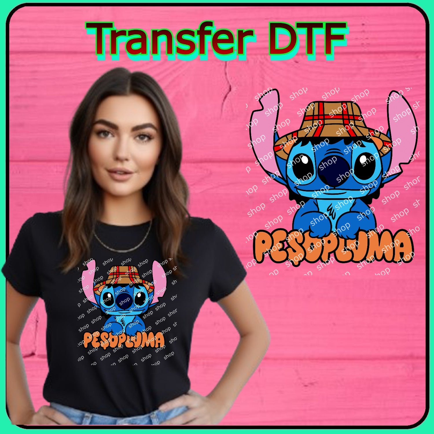 Diseño divertido de un muñequito azul con sombrero a cuadros y estilo urbano. Ideal para dar un toque moderno y original a camisetas de mujer. Transfer de alta calidad disponible en varios tamaños para personalizar prendas.
