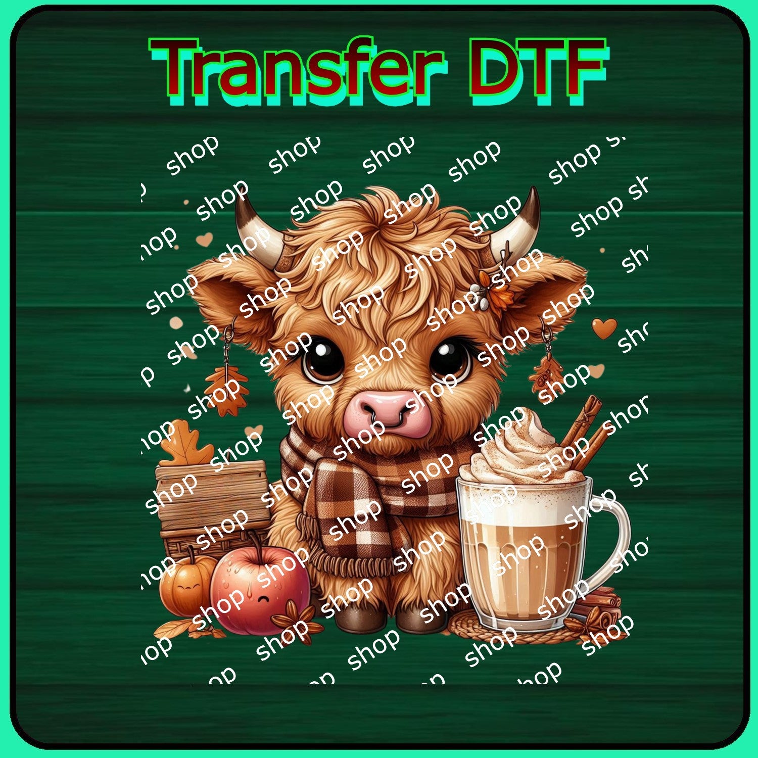 .Adorable diseño DTF 9X9 INCH de vaquita estilo kawaii con bufanda otoñal, bebida con crema y canela, manzanas y hojas de otoño. Perfecto para camisetas, sudaderas y accesorios en temporada de Halloween y otoño.